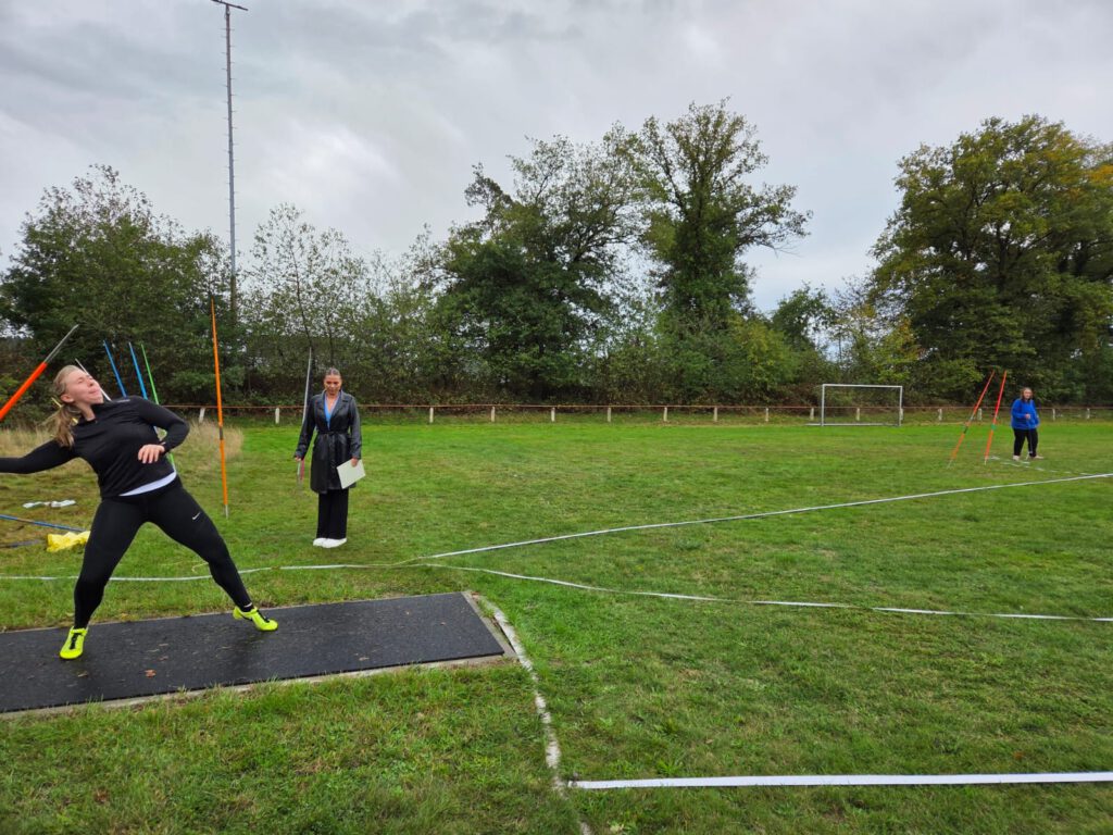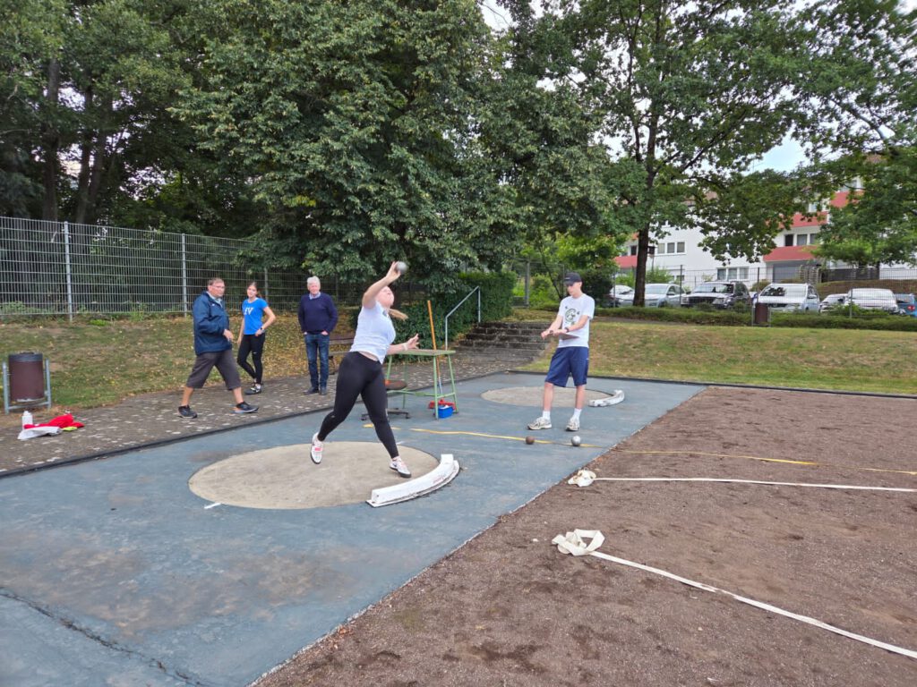 Leonie konnte auch am Saisonende vor allem im Kugelstoßen überzeugen. Am 3.September startete Leonie in Westerburg nur im Kugelstoßen, da andere Wurfdisziplinen nicht im Wettkampfprogramm waren. Leonie erreichte ordentliche 10,28m. Noch viel höher einzuschätzen war ihre Kugelstoßleistung am 4.Oktober in Villmar. Bei strömendem Regen und demzufolge rutschigem Ring erreichte Leonie 10,26m. Leonie hatte in dieser Saison regelmäßige Wettkampfleistungen über 10m. In Villmar startete Leonie auch im Steinstoßen und der 5kg Stein landete bei 9,09m in der Sandgrube. Leonies Trainer Jörg Rammner staunte über die selbstbeigebrachte Technik im Steinstoßen, denn er hat überhaupt keine Ahnung in dieser Disziplin. Auch wenn die Speerwurfleistung (dem Wetter geschuldet) bei 25,55m lag, kann Leonie mit dem Wettkampf in Villmar sehr zufrieden sein. Leonie hat auch in diesem Jahr bei den Frauen an vielen Wettkämpfen teilgenommen und musste teilweise auch ohne ihrem Trainer zu den Wettkämpfen fahren. Sie ist damit ein Vorbild für unsere jüngeren Athletinnen und Athleten. Herzlichen Glückwunsch Leonie zu den hervorragenden Leistungen in der Leichtathletiksaison 2025.